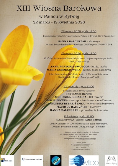 Zapraszamy na koncerty 13. Wiosny Barokowej w Pałacu w Rybnej! W tym roku Festiwal rozpocznie nowy cykl koncertowy pt. Cztery Pory Roku w Pałacu w Rybnej, wpisujący się w obchody 500-lecia założenia naszego miasta. Koncert inauguracyjny przyniesie prawdziwe arcydzieło literatury klawesynowej – słynne „Wariacje Goldbergowskie” Jana Sebastiana Bacha, wykonane przez znakomitą klawesynistkę, tarnogórzankę Hannę Balcerzak. Pierwszy dzień wiosny to także rocznica urodzin Jana Sebastiana Bacha oraz Early Music Day – międzynarodowe święto muzyki dawnej. Będziemy celebrować je wspólnie również w Tarnowskich Górach!